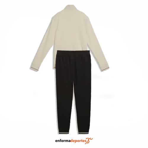 Chandal mujer PUMA METALLIC FULL-ZIP, confeccionado en tejido poliester reciclado felpa francesa, de corte estándar, compuesto de dos piezas, parte superior con cuello alto, manga larga, cierre con cremallera completa y bolsillos laterales, parte inferior pantalon de talle medio, bolsillos laterales y bajos elásticos.