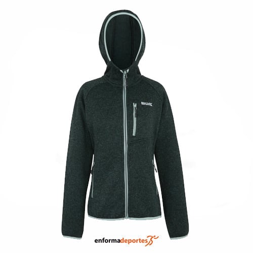 Polar mujer REGATTA NEWHILL, confeccionado en tejido 100 % poliéster con efecto de punto jaspeado y reverso cepillado – 280 g/m², con 2 bolsillos inferiores con cremallera y 1 bolsillo con cremallera en el pecho, con ribete elástico en la abertura de la capucha, los puños y el dobladillo.