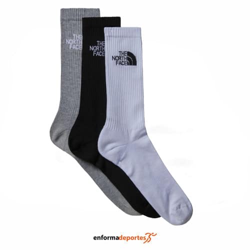 Calcetines unisex THE NORTH FACE MULTI SPORT CUSH CREW, con borde superior de canalé con logotipo, zona de ventilación, malla 2×1 en la parte superior del pie, con banda de soporte en el empeine, puntera y talón acolchados y planta ligeramente acolchada