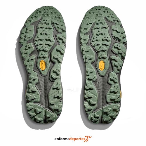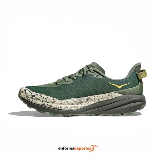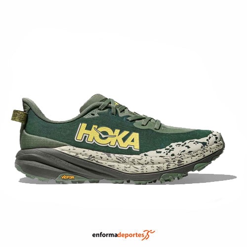 Zapatilla hombre HOKA SPEEDGOAT 6, fabricada en su parte superior de tejido ligero con refuerzos en puntera y lengüeta, con una pisada con capacidad de respuesta y adherencia para terrenos técnicos, con chasis con sujeción interna, entresuela ligera, con cierre con cordones para mayor sujeción y con suela Vibram® Megagrip con taco de tracción con tacos de 5mm para mayor sujeción en todo tipo de terrenos.